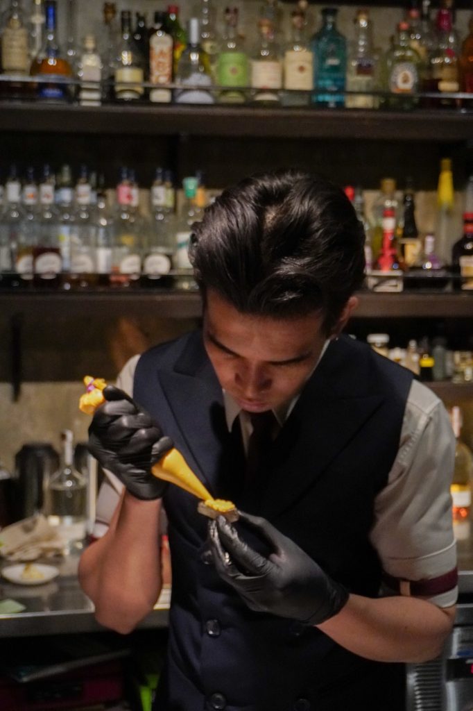 While we did visit 3 bars in Legazpi Village (including Grasshopper and From Management), we spent the majority of the night at The Curator, where Bangkok’s G.O.D. (Genius on Drugs) was running a guest shift. This is a bar famous for its garnishes, and they did not disappoint. They brought a level of culinary precision that felt more like a tasting menu than a bar shift. We saw hand-built saucers featuring ingredients like salmon roe or black truffle on pork rind served alongside every drink.