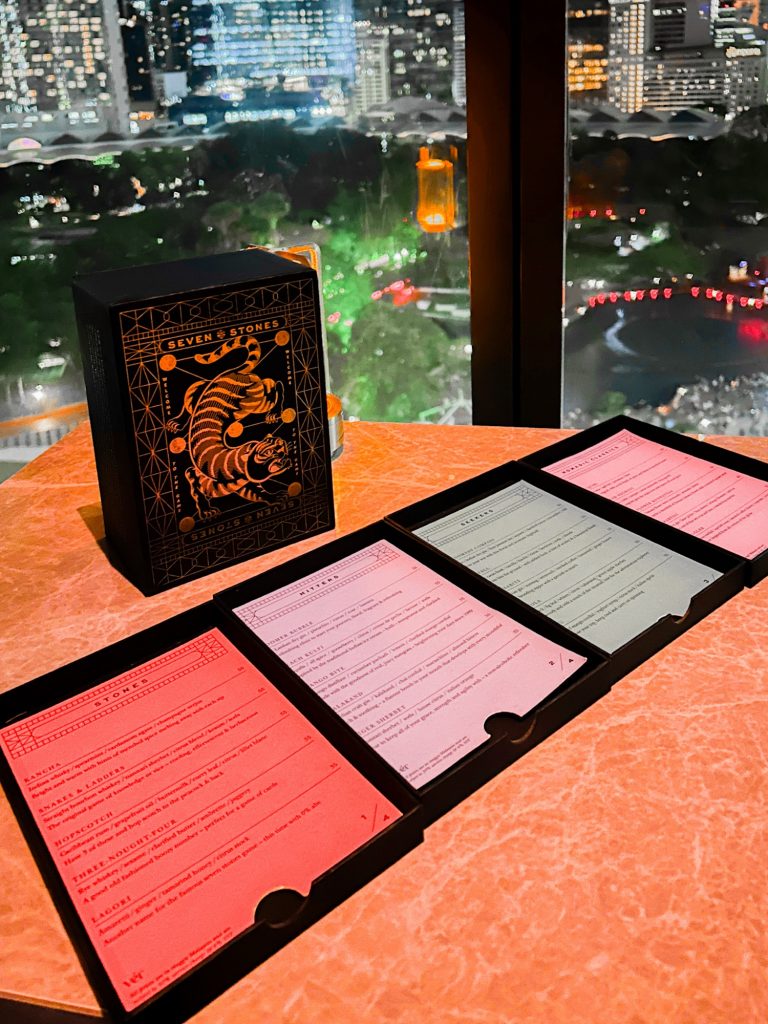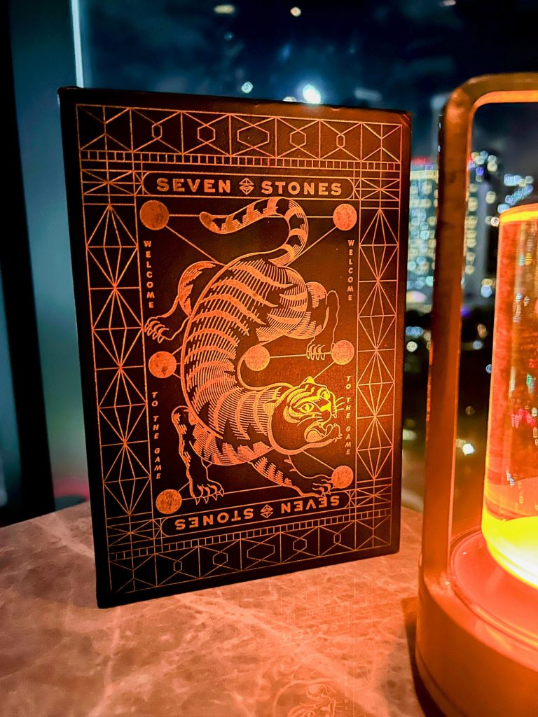 Their menu — inspired by South Indian and Sri Lankan childhood games, treats and flavors — is divided into 4 sections: Stones, Hitters, Seekers and Nomadic Classics. It was presented to us in a box drawer with a gold-embossed tiger welcoming us into the game.